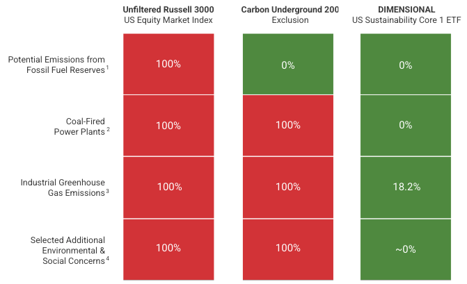 1 Source: Dimensional Sustainability Report for US Sustainability Core 1 ETF (data as of June 30, 2025). Weighted Average Potential Emissions from Reserves (from which this reduction in exposure was calculated) is found using a theoretical estimate calculated by MSCI of carbon dioxide produced if a company’s reported reserves of oil, gas, and coal were converted to energy, given estimated carbon and energy densities of the respective reserves, for each portfolio or index company and calculating the weighted average by portfolio or index weight. Potential Emissions from Fossil Fuel Reserves data is provided by third-party data providers, and methodology is subject to change with data developments or other findings or events.